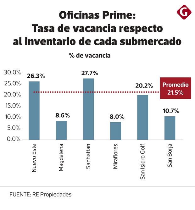 De acuerdo al reporte de oficinas Prime de RE Propiedades, este segmento registra 213,764 m2 de oficinas libres, con una tasa de vacancia de 21.5% al cierre del primer trimestre. Cerca del 80% de la desocupación se ubica en los submercados Sanhattan (San Isidro financiero) y Nuevo Este (Surco y La Molina, principalmente), con vacancias de 43.2% y 34.1 %, respectivamente. Por el contrario, Magdalena y Miraflores alcanzaron niveles bajos de desocupación en oficinas, registrando tasas inferiores al 10%.