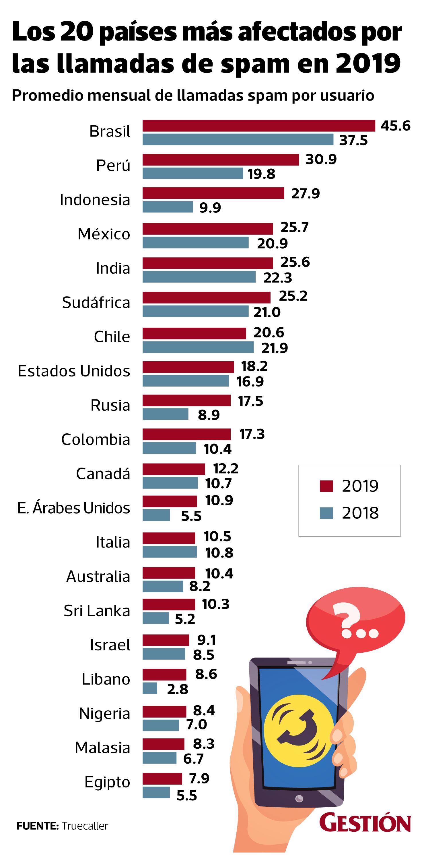 Este año sigue siendo liderado por Brasil, que pasó de recibir 37,5 llamadas no deseadas al mes a 45,6. Perú pasó de recibir 19,8 llamadas mensuales a 30,9 llamadas mensuales; es decir, al menos una llamada todos los días.