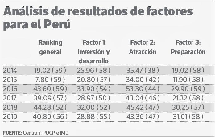 Así, este retroceso se evidenció también en los tres factores: en inversión y desarrollo cayó tres posiciones; en atracción se mantuvo en el puesto 47 pero cayó en puntaje de 45.4 a 43.4 puntos; y en preparación cayó un puesto al 58, a pesar de aumentar en puntaje.