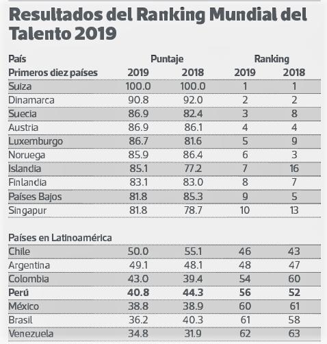 En el Ranking Mundial del Talento 2019, presentado por Centrum PUCP en alianza con el Institute of Management Development (IMD) de Suiza, el Perú cayó cuatro posiciones versus los resultados del 2018, pasando al puesto 56 de 63 países analizados.