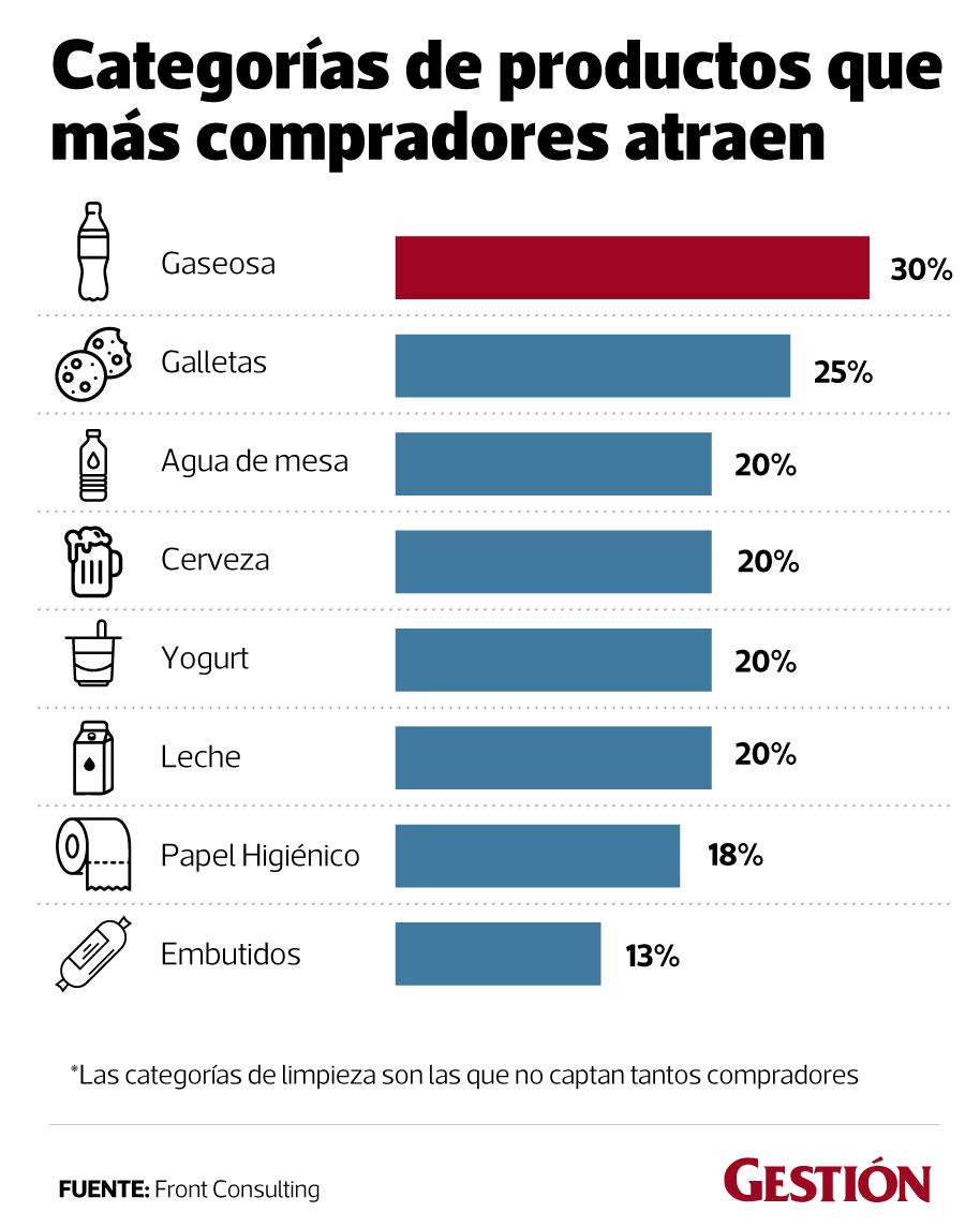 Refirió que las categorías de productos que más compradores atraen son gaseosas (30%), galletas (25%), agua de mesa (20%), cerveza (20%), entre otros. Las categorías de limpieza no atraen tantos consumidores a este tipo de formato.