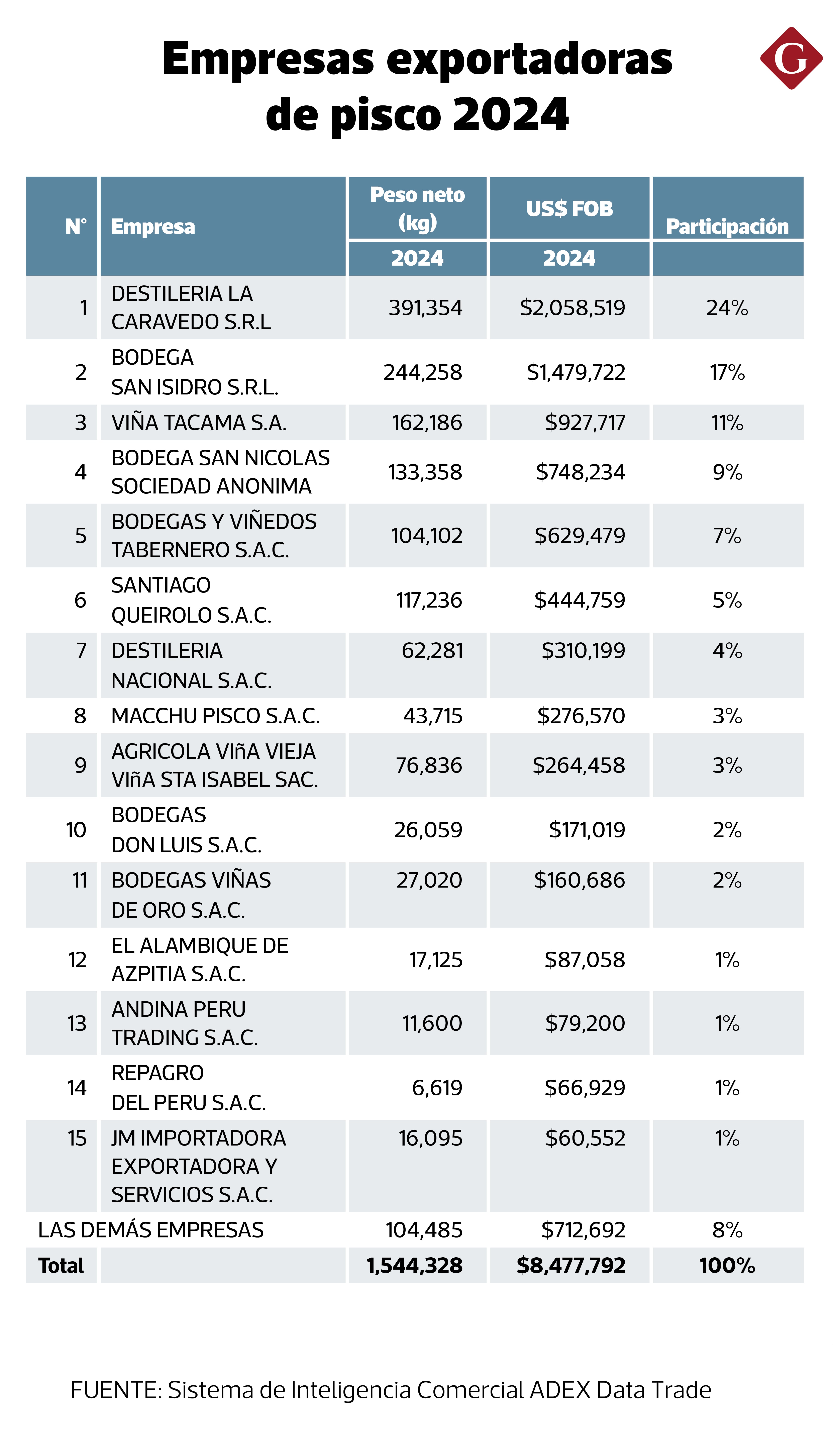 La denominada bebida bandera del Perú; es decir, el pisco, deleita a consumidores nacionales, pero también a extranjeros que se rinden ante el buen sabor de este destilado. Así, al cierre del 2024, los envíos de esta bebida representaron US$ 8,477,792 y el 68% de ese valor de exportaciones se concentró en cinco importantes firmas de este rubro, según información del Sistema de Inteligencia Comercial ADEX Data Trade.