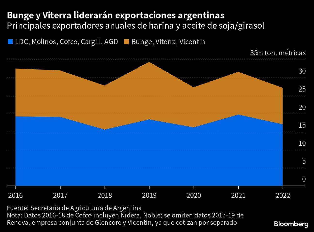 La empresa combinada podría llegar a tener el 40% de la capacidad de procesamiento de semillas oleaginosas de Argentina si se concreta una operación previamente acordada para rescatar al proveedor de soja en quiebra Vicentin SAIC, según cálculos de Bloomberg basados en datos de la corredura de cereales JJ Hinrichsen. Es probable que esto desencadene el escrutinio de las autoridades reguladoras.
