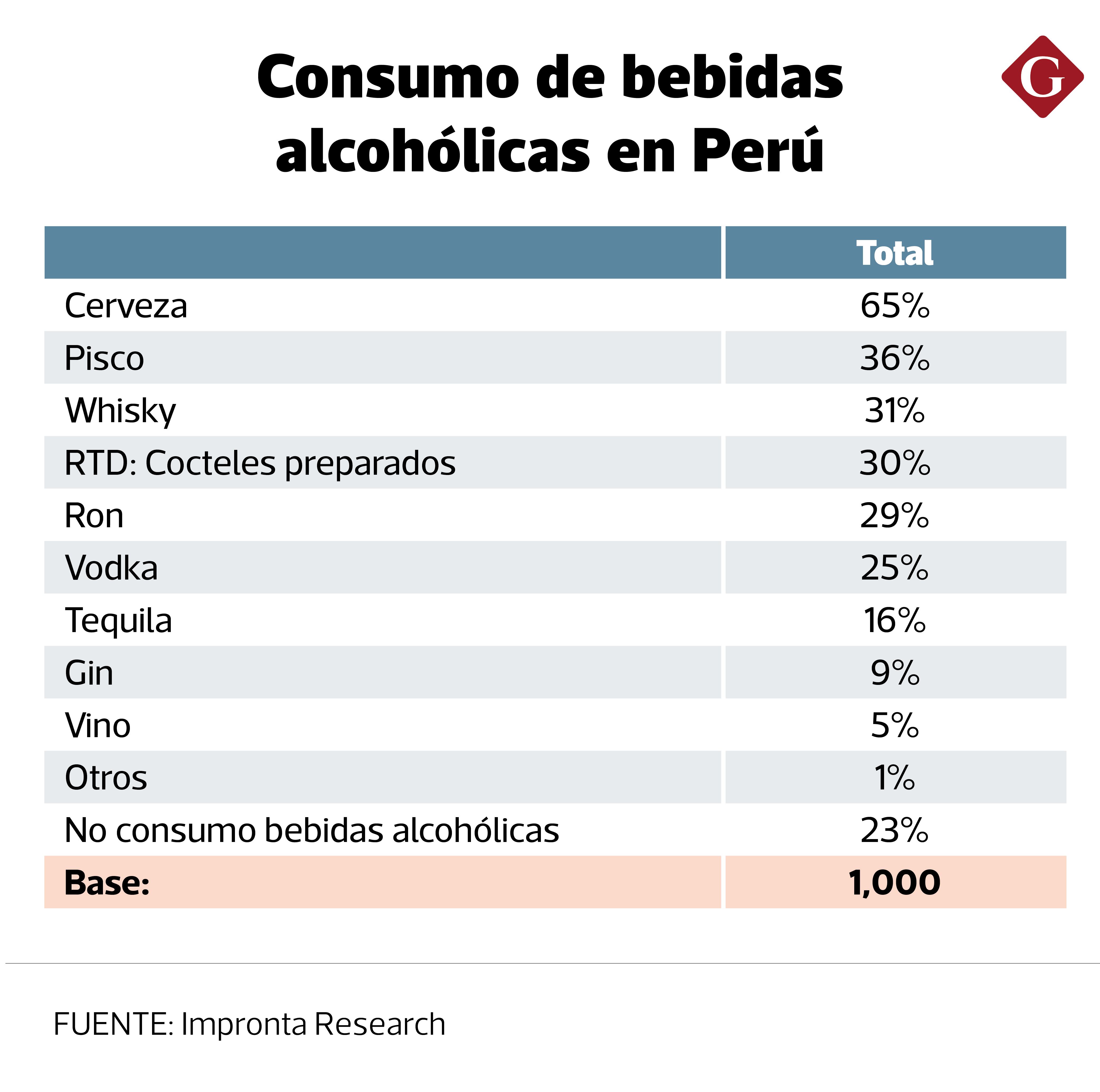 En promedio, los peruanos consumen tres tipos de bebidas alcohólicas: cerveza, pisco y RTD. Esta última se ha convertido en la preferida del 10% de los consumidores, desplazando al pisco (6%), aunque todavía lejos de la cerveza, que mantiene el 67% de preferencia.