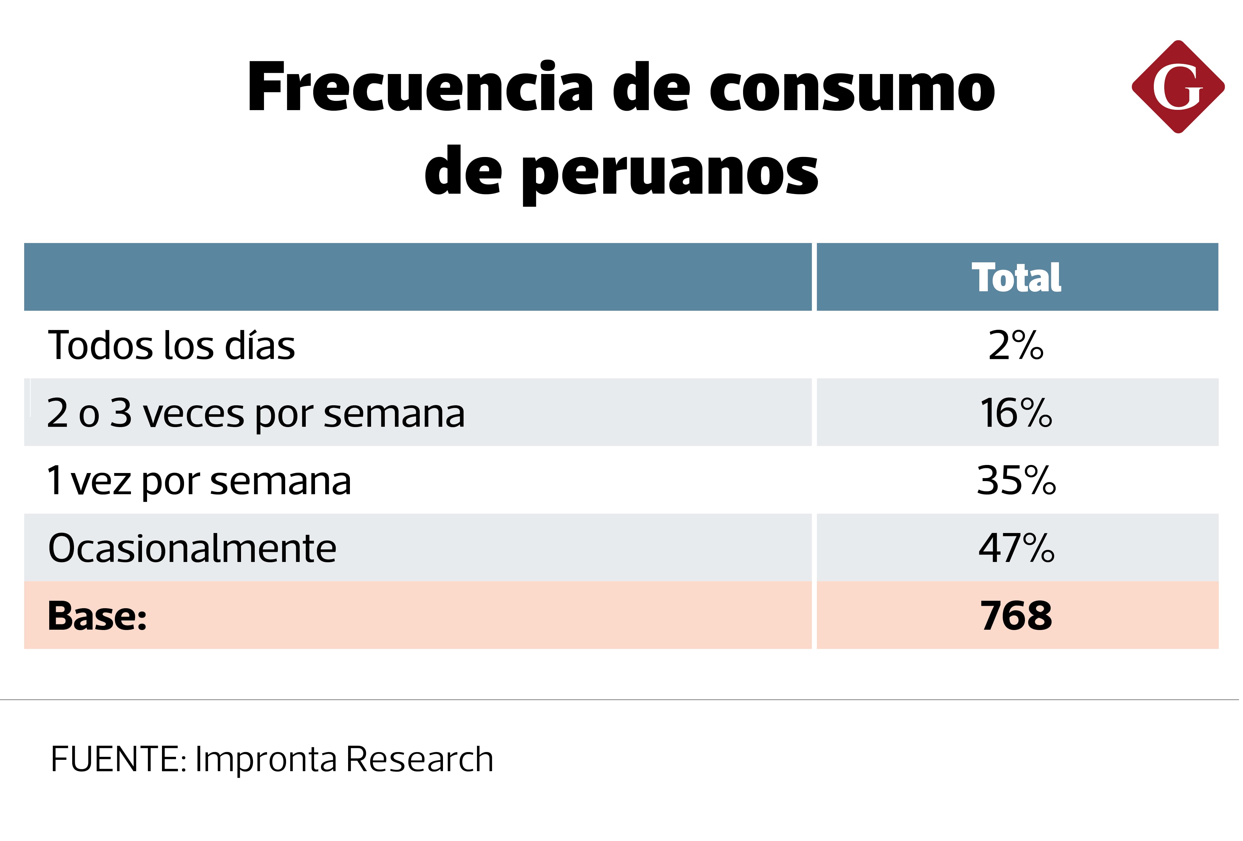Sin embargo, el especialista consideró difícil que las bebidas RTD alcancen a la cerveza en el corto plazo. “La diferencia está en el precio. El costo por mililitro de la cerveza es más bajo, mientras que el de las RTD es mayor porque tienen un porcentaje de alcohol más alto. Son productos que responden a ocasiones distintas de consumo”, dijo. La pesquisa también analizó la frecuencia de consumo de bebidas alcohólicas entre los peruanos. Aunque el 47% lo hace de manera ocasional, un 16% consume entre dos y tres veces por semana, con mayor concentración en Lima y el norte del país, a diferencia de otras regiones.