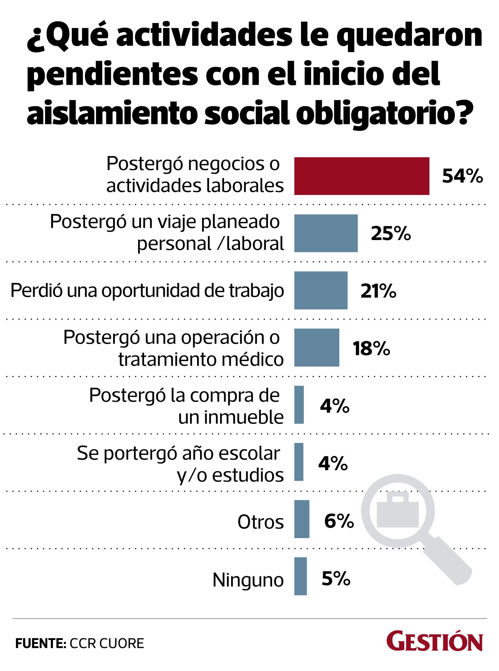 Según un reporte de CCR Cuore, el 54% de limeños postergó negocios o actividades laborales debido al aislamiento social; el 25% postergó un viaje y el 21% perdió una oportunidad laboral; esto se incrementa en el NSE C (24%).