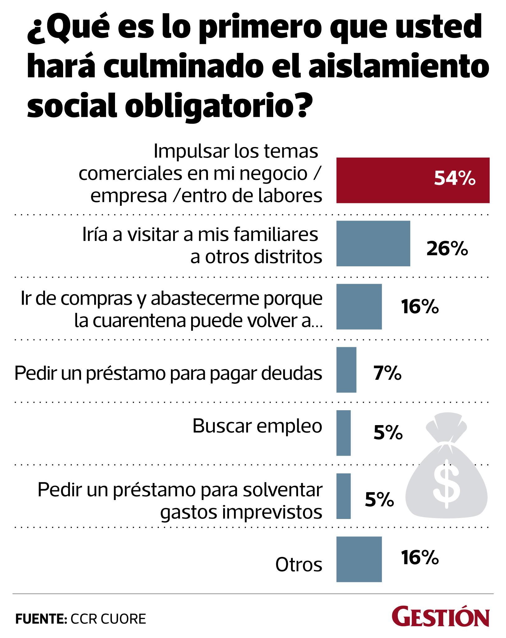 El estudio también reveló que lo primero que harán los limeños al levantarse la cuarenta será impulsar los temas comerciales en su negocio, empresa, o centro de labores (54%), seguido de visitar familiares.