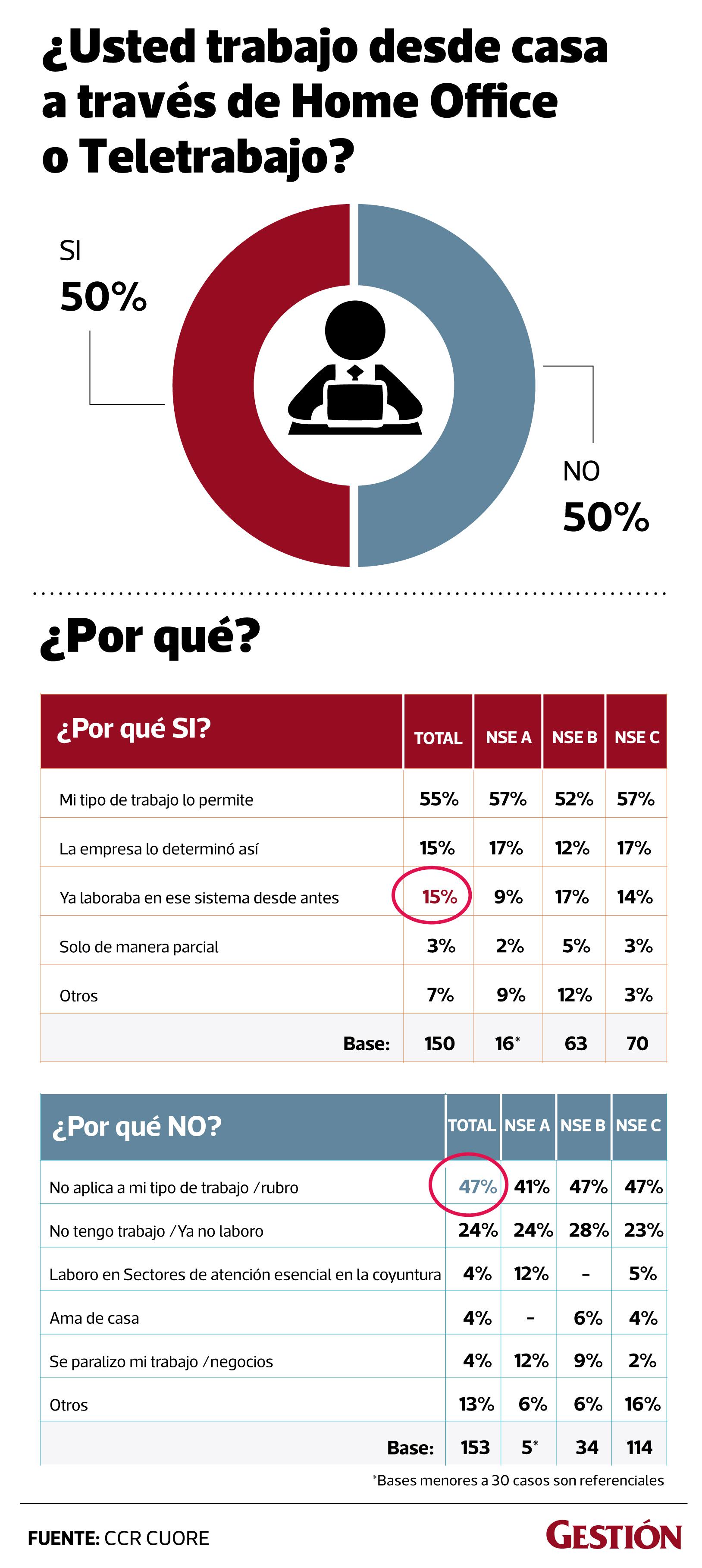 Además, el trabajo desde casa o “home office” ha sido implementado y utilizado por lo menos por el 50% de los entrevistados; siendo más marcado en los NSE A y B.