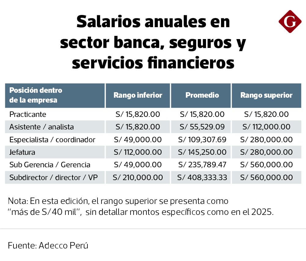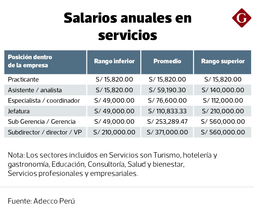 “En el sector de servicios, los ingresos anuales varían según el nivel del cargo. En el extremo superior de la escala, los subdirectores, directores y vicepresidentes pueden percibir en promedio S/ 371,000 al año".