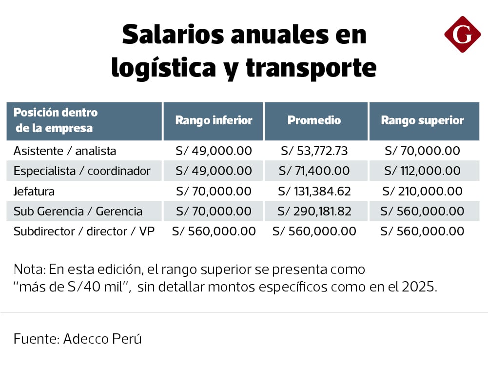 Dentro de los sectores analizados, logística y transporte destacó como uno de los mejores pagados en el nivel de alta dirección. Los directores y vicepresidentes (VP) en este rubro perciben un salario anual promedio de S/ 560,000. “El sector ha generado numerosas oportunidades laborales y ha incrementado el valor de posiciones específicas para impulsar el comercio electrónico”, afirmó Luis Zavalaga, gerente de Training & Consulting de Adecco Perú, a Gestión.
