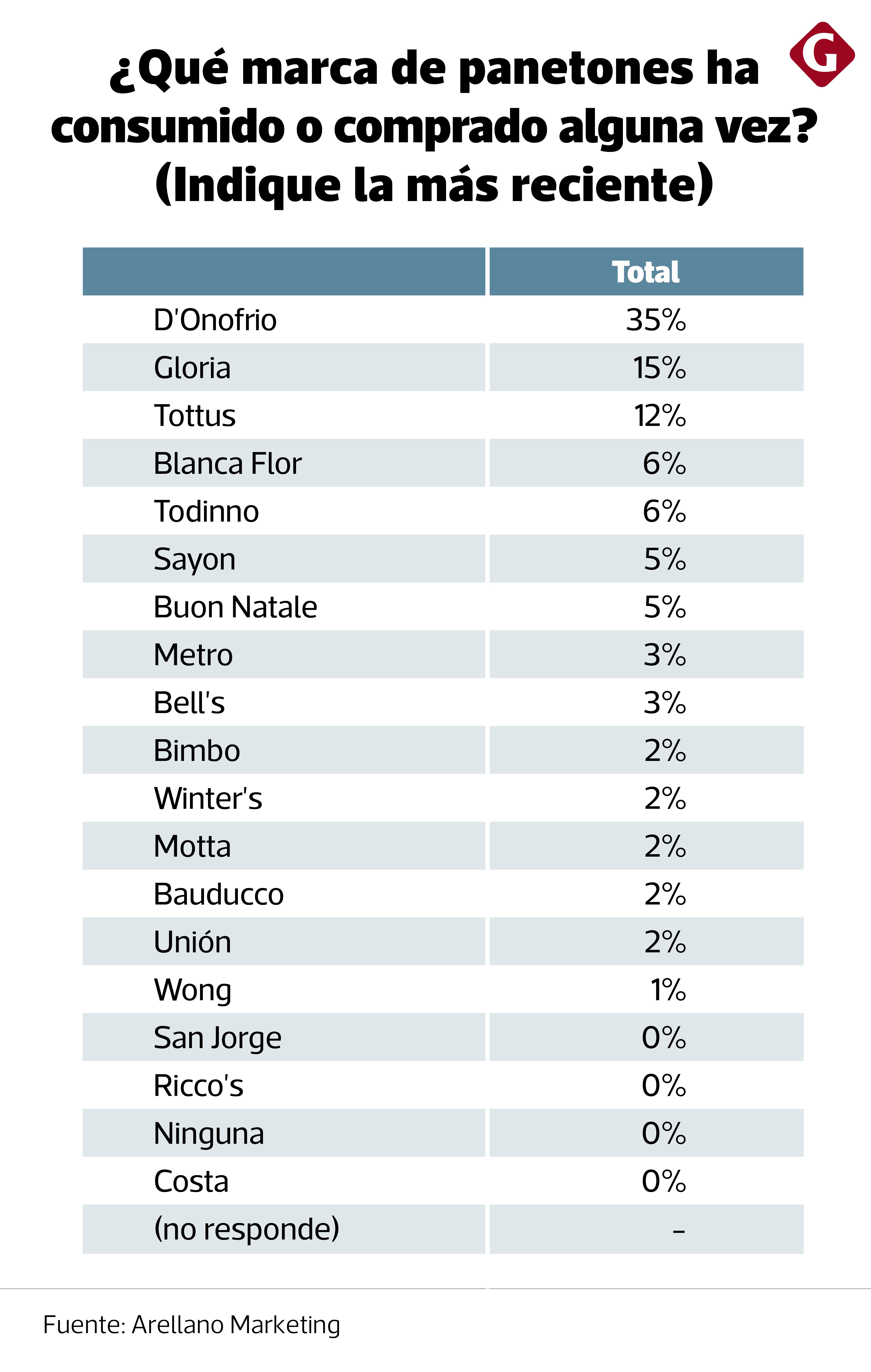 Respecto a las marcas, el 35% afirmó que alguna vez ha consumido el panetón D’Onofrio, 15% el de Gloria y 12% el de la cadena Tottus. Le siguen Blanca Flor (6%), Todinno (5%), Sayon (3%) y Buon Natale (3%). Metro, Bell’s, Winter’s, Bimbo, Motta, Bauducco y Unión alcanzaron el 2% y Wong el 1%.