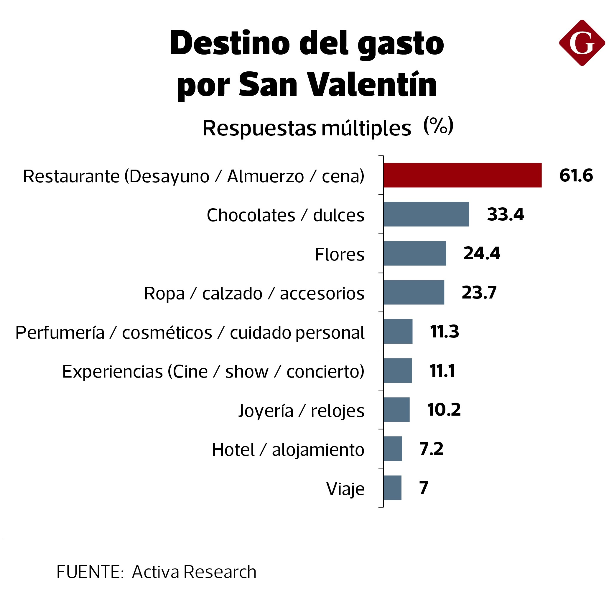 Entre las categorías que se visualizan como las favoritas para ser objeto de regalo, figuran invitaciones para desayunar, almorzar o cenar en restaurantes (61.6%), obsequio de chocolates y dulces (33.4%), flores (24.4%), además de ropa, calzado y accesorios (23.7%).