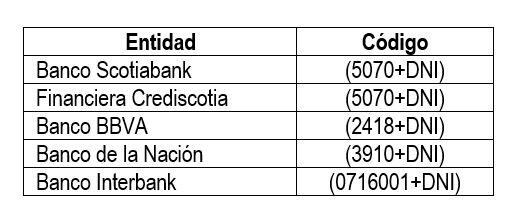 La Superintendencia de Banca, Seguros y AFP (SBS) informó que las personas con deudas pendientes con Financiera TCF podrán realizar el pago de sus créditos a partir del martes 17 de diciembre de 2019, a través de las siguientes entidades y utilizando los códigos señalados: