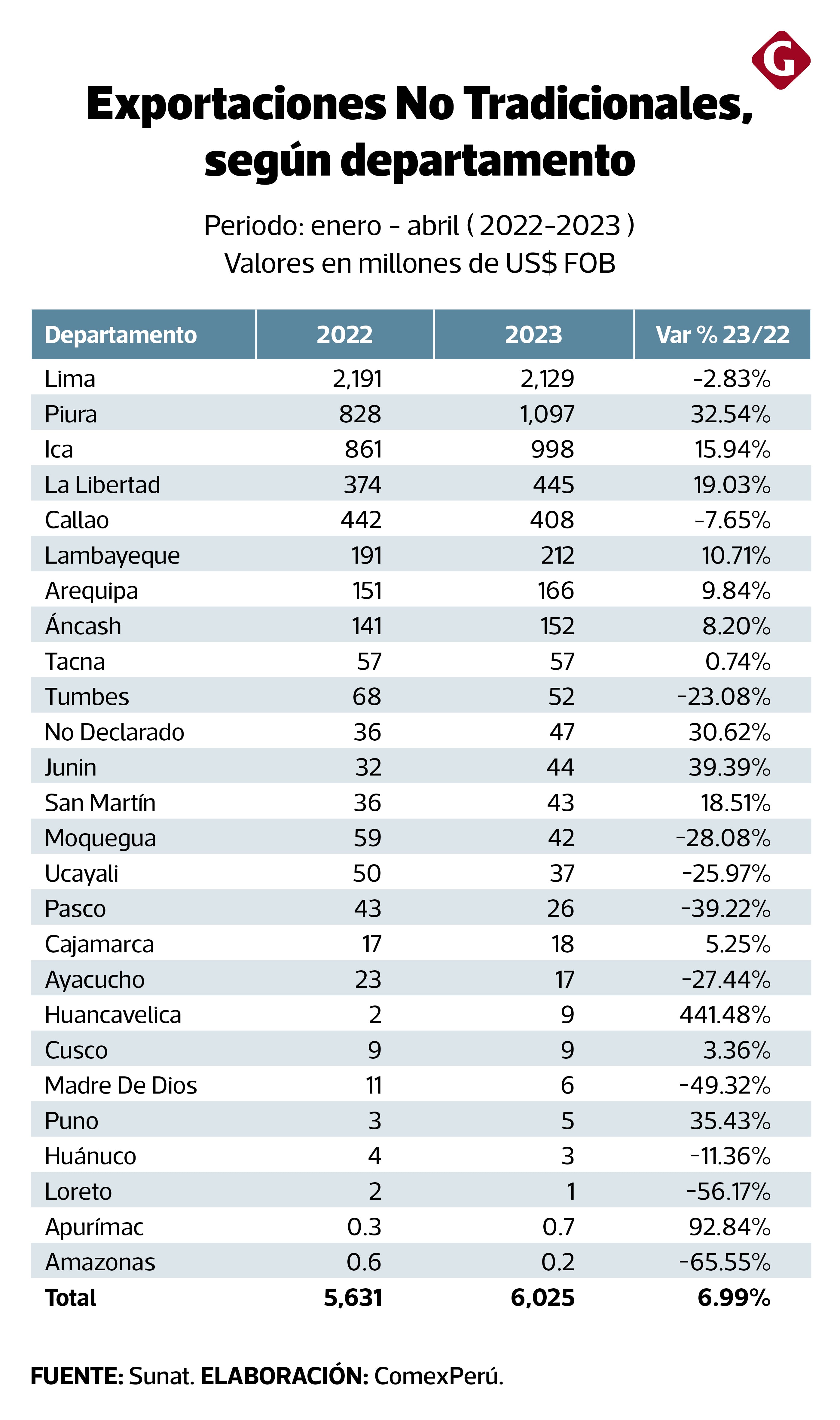“La mayoría de estos cultivos se producen en La Libertad, Piura, Lambayeque, los cuales son los principales departamentos agroexportadores y a la vez los más perjudicados ante este tipo de eventos. Así, también exportaciones como la uva, el arándano y la palta muestran volúmenes en crecimiento”, anota.