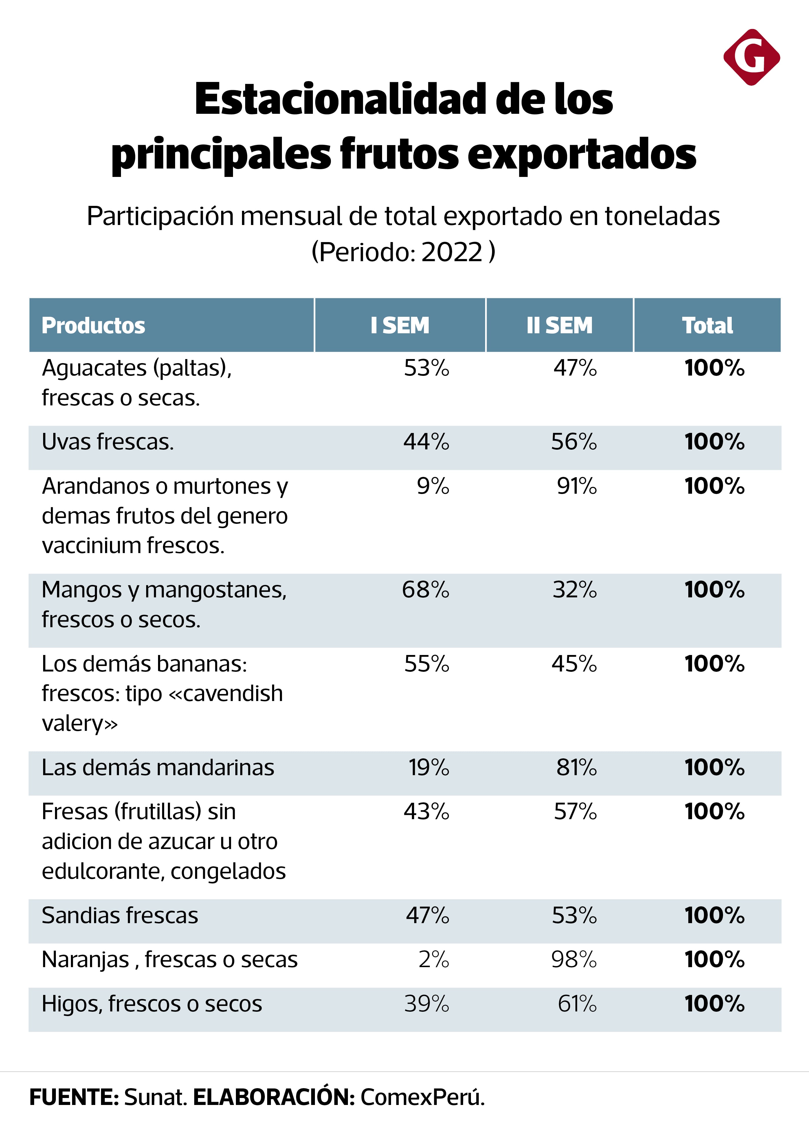 En el entorno agroexportador las alarmas se encienden, sobre todo, para aquellos productos que son más constantes en envíos de cara al segundo semestre del año. El gerente de Estudios Económicos de la Sociedad de Comercio Exterior del Perú (ComexPerú), Rafael Zacnich, sostiene que la uva, los arándanos, la palta, entre otros, son los que registran despachos mayores en los últimos seis meses del año y, por ende, cultivos con una mayor probabilidad de afectación.