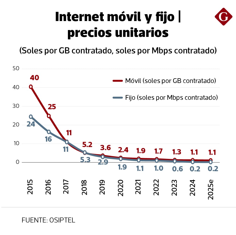 “En el servicio móvil el precio ronda S/ 1.10 por GB y en el internet fijo S/ 0.20 por Mbps. La caída de precios responde a la competencia y beneficia al mercado, pero la política pública debe considerar cómo hacer sostenibles esos niveles”, señaló.