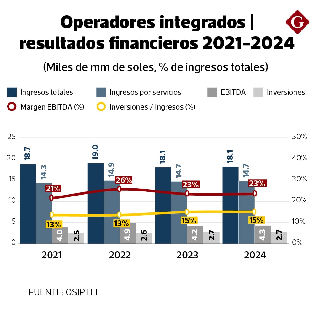 Este escenario contrasta con el desempeño financiero de los operadores integrados (servicios móviles y fijos). En los últimos cuatro años (2021-2024), sus ingresos por servicios —sin considerar la venta de equipos u otros ingresos comerciales— se han mantenido en un rango de entre S/ 14,000 millones y S/ 15,000 millones.