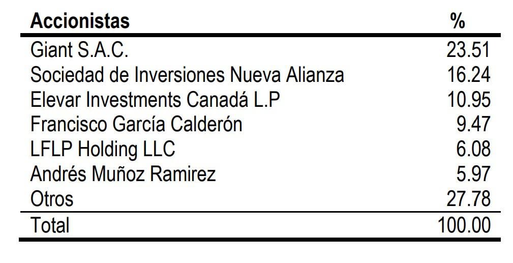 Actualmente, el accionariado de la Financiera está compuesto de la siguiente manera: Giant S.A.C. con 23.51%, Sociedad de Inversiones Nueva Alianza con 16.24%, Elevar Investments Canadá L.P con 10.95%, Francisco García Calderón Portugal con 9.47%, LFLP Holding LLC con 6.08%, Andrés Muñoz Ramírez con 5.97% y otros con 27.78% (ver cuadro).