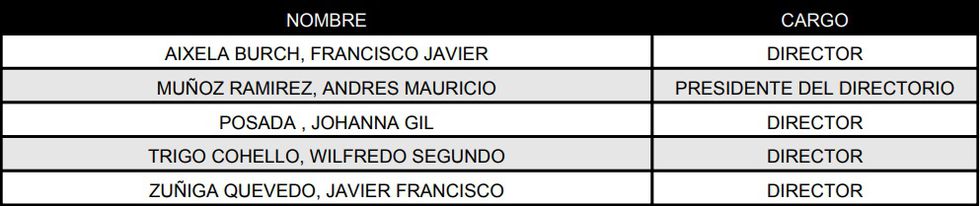 Según un reporte de la clasificadora de riesgo Class & Asociados, el principal promotor de TFC es el Sr. Andrés Muñoz Ramírez, funcionario con experiencia en el sistema financiero local. Muñoz es inversionista de: Sociedad Inversiones Nueva Alianza S.A.C. (40%), Financiera TFC S.A. (5.97%) y Promotora Chulucanas S.A.C. (40.58%). Esta es la conformación del directorio de la Financiera TFC:
