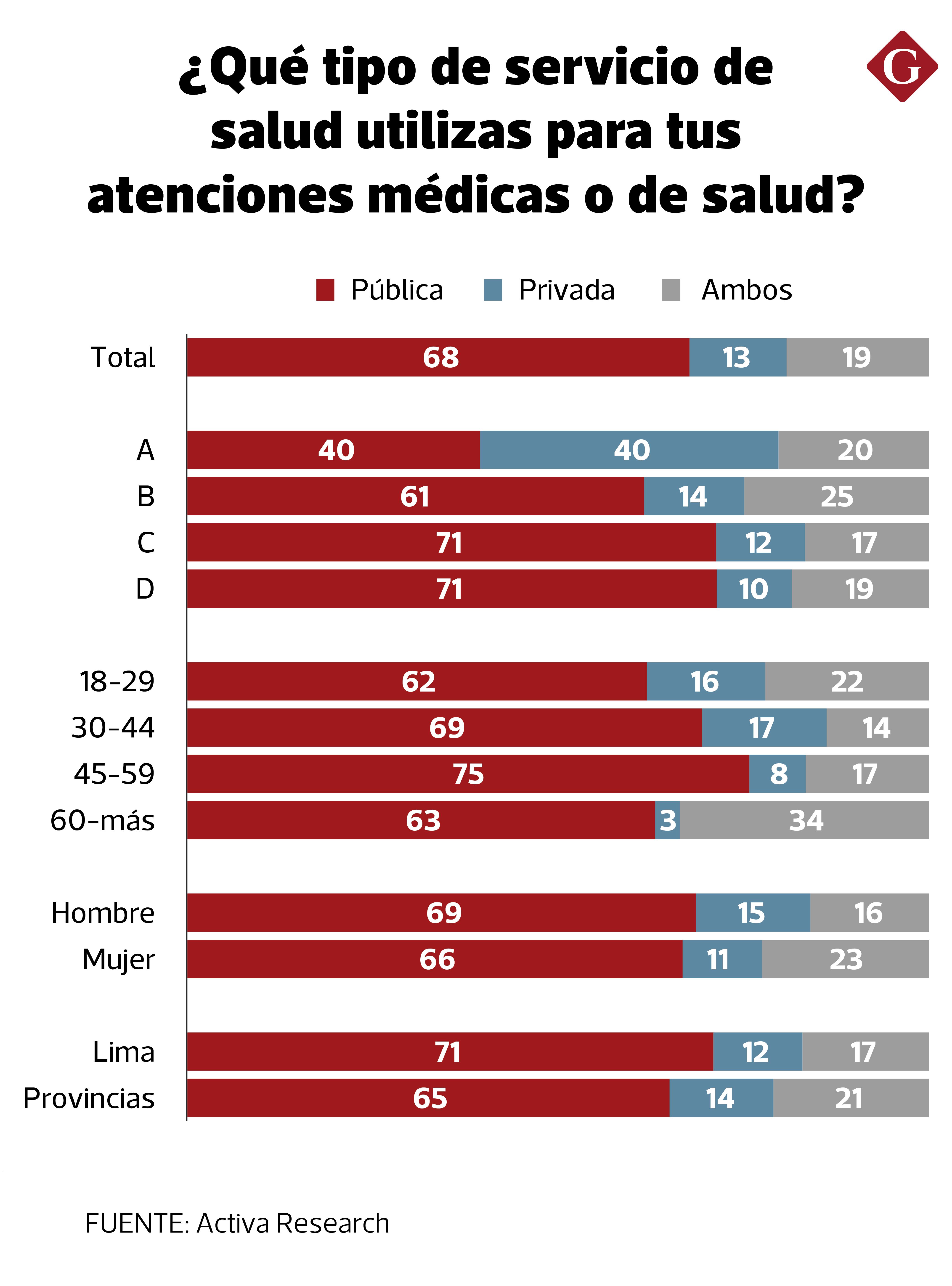 El análisis concluyó que un 68% de la población peruana se atiende a través del servicio de salud público; mientras que un 13% utiliza el servicio de salud privado y un 19% demanda de ambos para sus atenciones. En esa línea, la atención pública se acentúa en los niveles socioeconómicos C y D de habitantes de la capital; a la vez que la atención privada predomina, principalmente, en personas entre 18 a 44 años del segmento A de Lima y provincias.