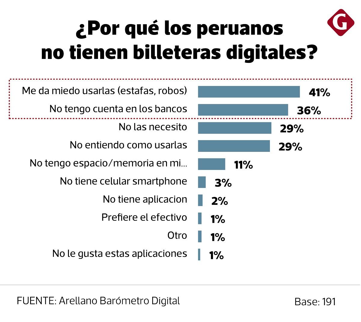 En contraparte, un 41% de los peruanos que no tienen una billetera digital indica que esto ocurre porque les da miedo usarlas (estafas, robos); un 36% no tiene cuenta en los bancos, mientras que un 29% no las necesita o no entiende cómo usarlas.
