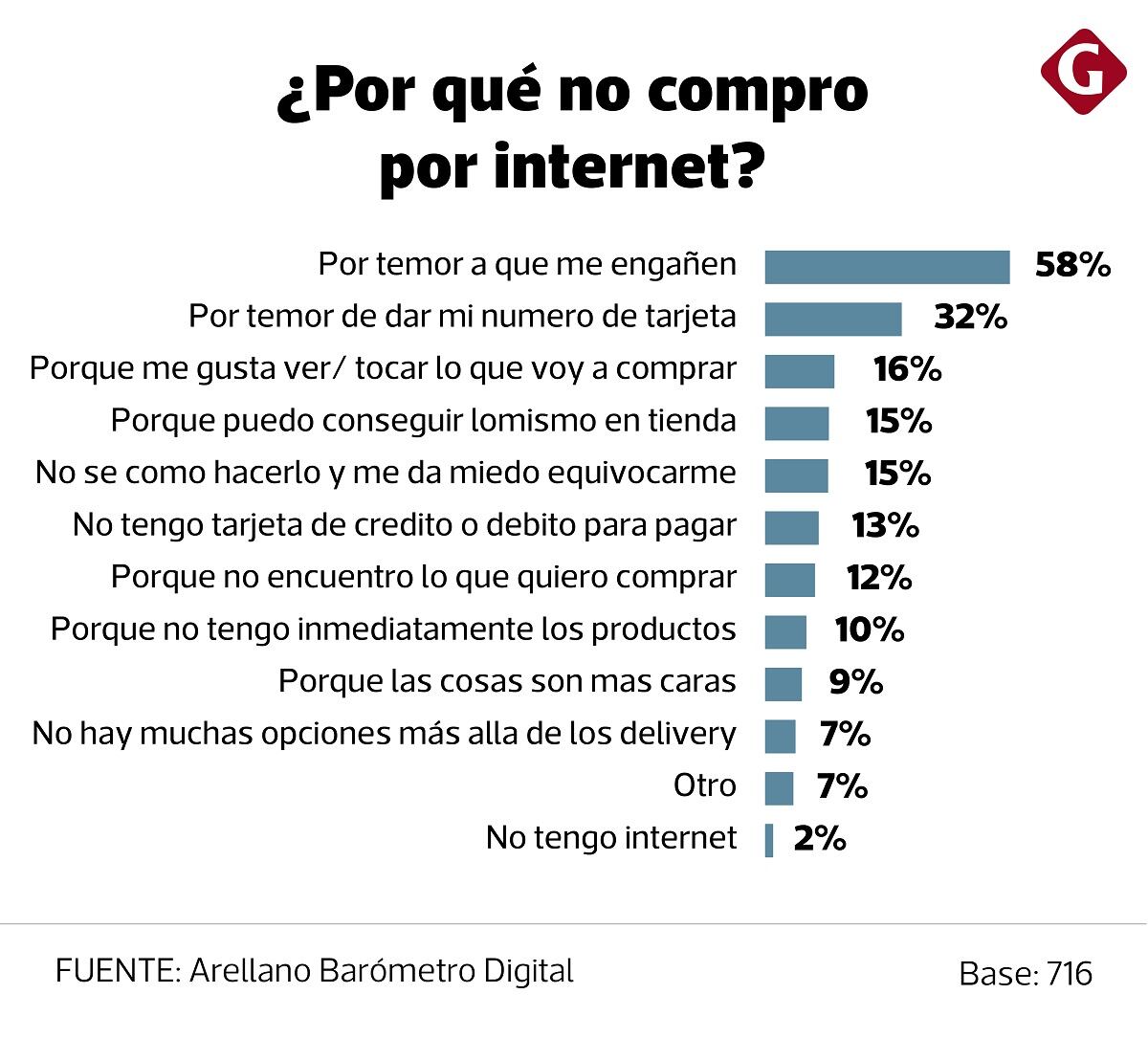 En ese sentido, el estudio también aborda las motivaciones por las que el peruano desiste de una compra por internet. Un 58% aduce que es por temor al engaño; seguido de un 32% que indica tener miedo de dar su número de tarjeta; además de un 16% que le gusta ver o tocar el producto que va a adquirir.