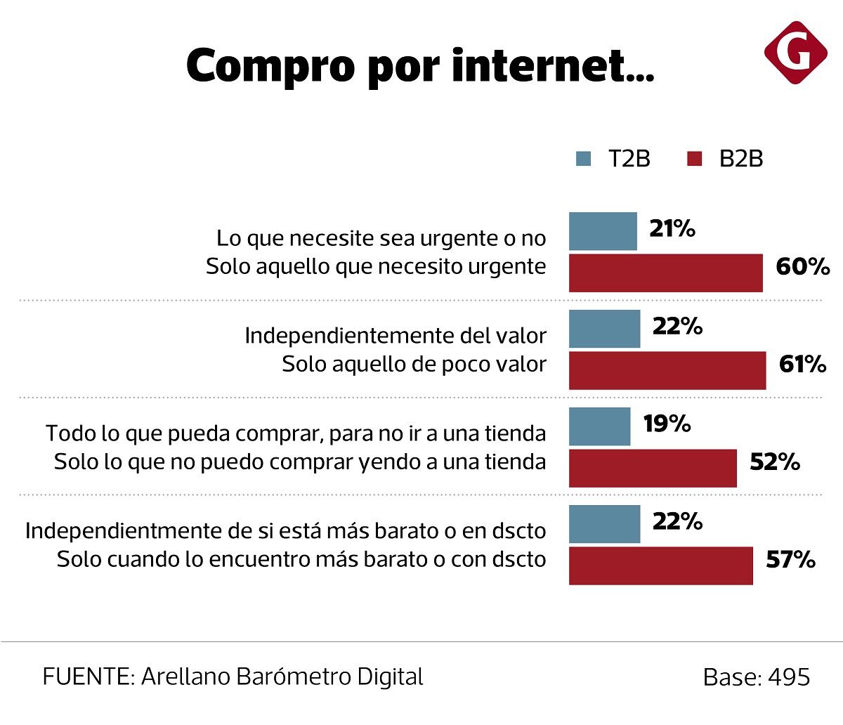 Otro punto que aborda el estudio de Arellano está relacionado al sitial que tienen las compras frente a otras acciones que realiza el peruano en el mundo digital. Así, “para comprar” y “buscar información para comprar”, tienen una representatividad de 38% y 45%, respectivamente.