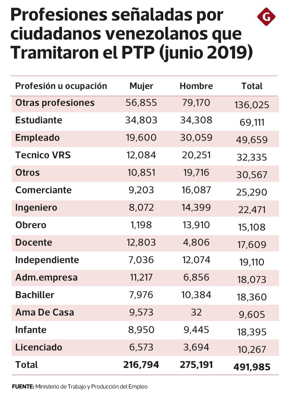 De otro lado, de acuerdo a la información de la Superintendencia de Migraciones de un total de 491,985 solicitudes de PTP, 136,025 ciudadanos venezolanos consignaron como principal grupo según profesión y oficio "otras profesiones".