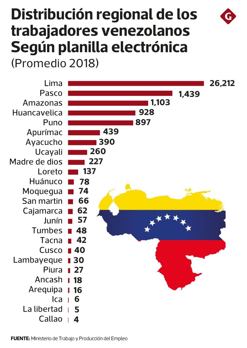 Así, otro dato estadístico del Ministerio de Trabajo revela que los trabajadores venezolanos se concentran casi en su totalidad en Lima y Callao, con el 85%, de un total de 32,606 personas registrados en planilla en promedio entre enero a marzo de 2019.