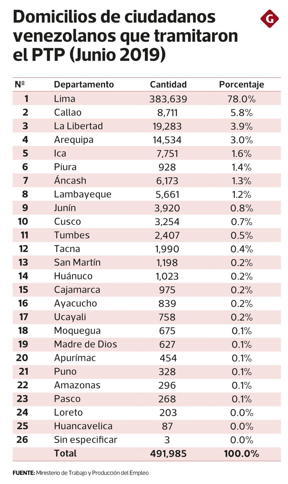 De acuerdo a la información de la Superintendencia Nacional de Migraciones el 78% de los ciudadanos venezolanos que tramitaron su Permiso Temporal de Permanencia (PTP) han señalado como domicilio Lima, y el 5.8% el Callao.