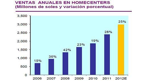 Las ventas de las principales tiendas de mejoramiento del hogar Home Center, que incluye a Sodimac , Maestro Perú, Cassinelli y Promart, sumarían S/.3,000 millones (US$ 1,130 millones), 25% más que lo registrado en el 2011, informó el Scotiabank en su Informe Semanal .