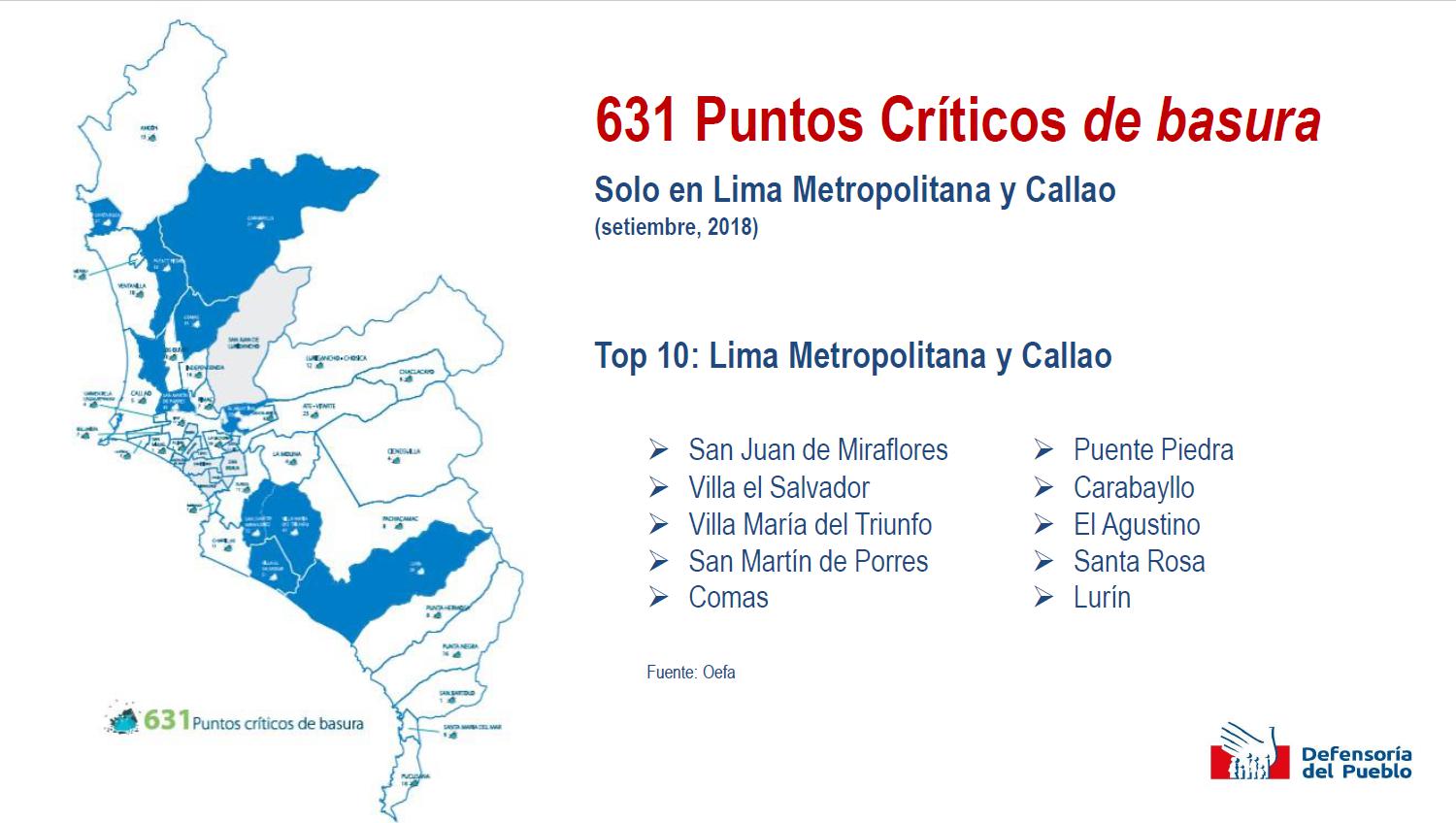 Así, en Lima Metropolitana y Callao se han identificado 631 puntos críticos de basura. Los 10 puntos con mayor riesgo se encuentran ubicados en San Juan de Miraflores, Villa El Salvador, Villa María del Triunfo, San Martín de Porres, Comas, Puente Piedra, Carabayllo, El Agustino, Santa Rosa y Lurín.