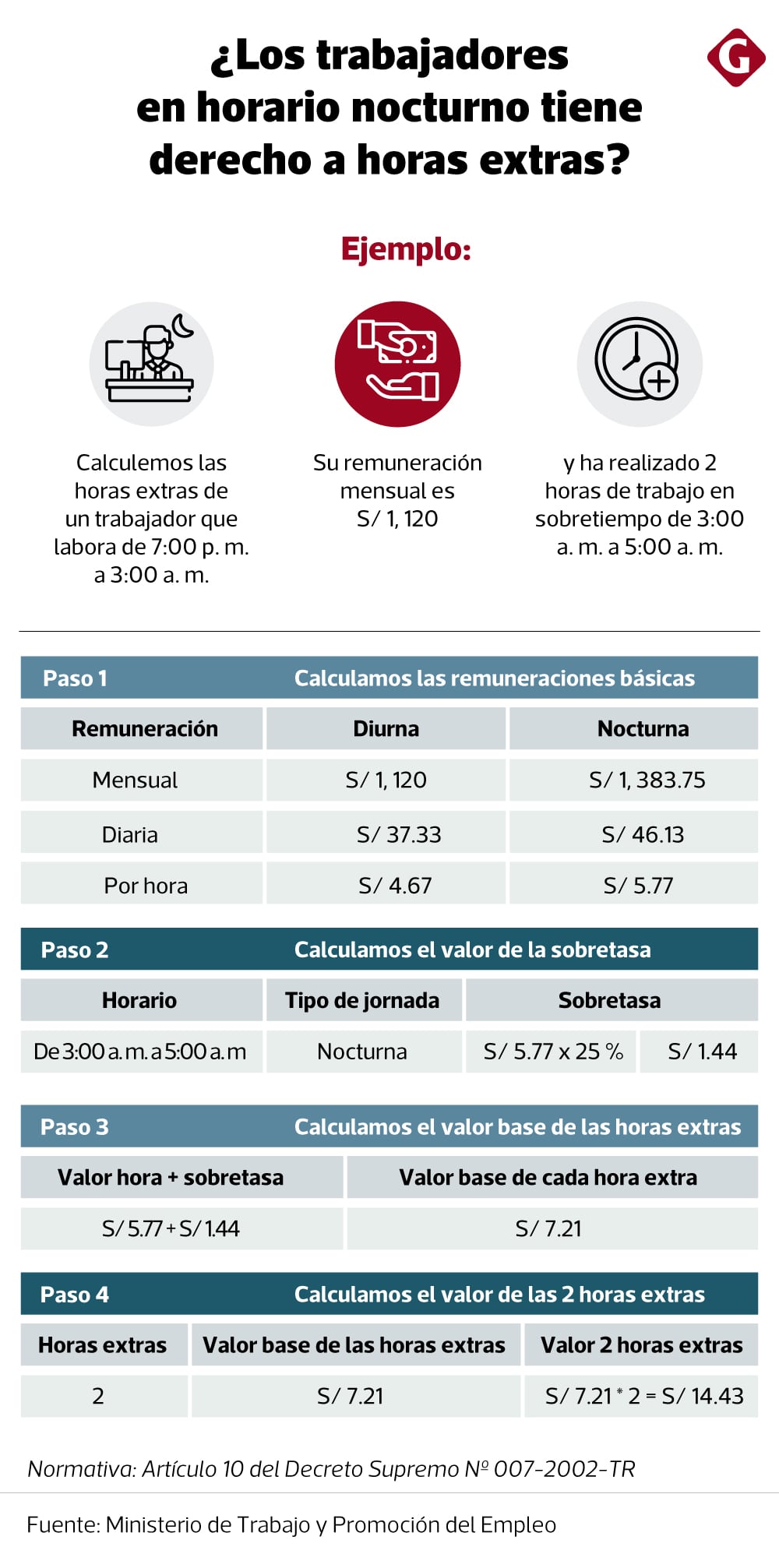 El Ministerio de Trabajo y Promoción del Empleo (MTPE) publicó una guía para el trabajador. Así, detalla que si se labora en horario nocturno se debe percibir, como mínimo, una remuneración mensual equivalente a la Remuneración Mínima Vital (RMV), hoy en S/ 1,025, incrementada con una sobretasa del 35%.