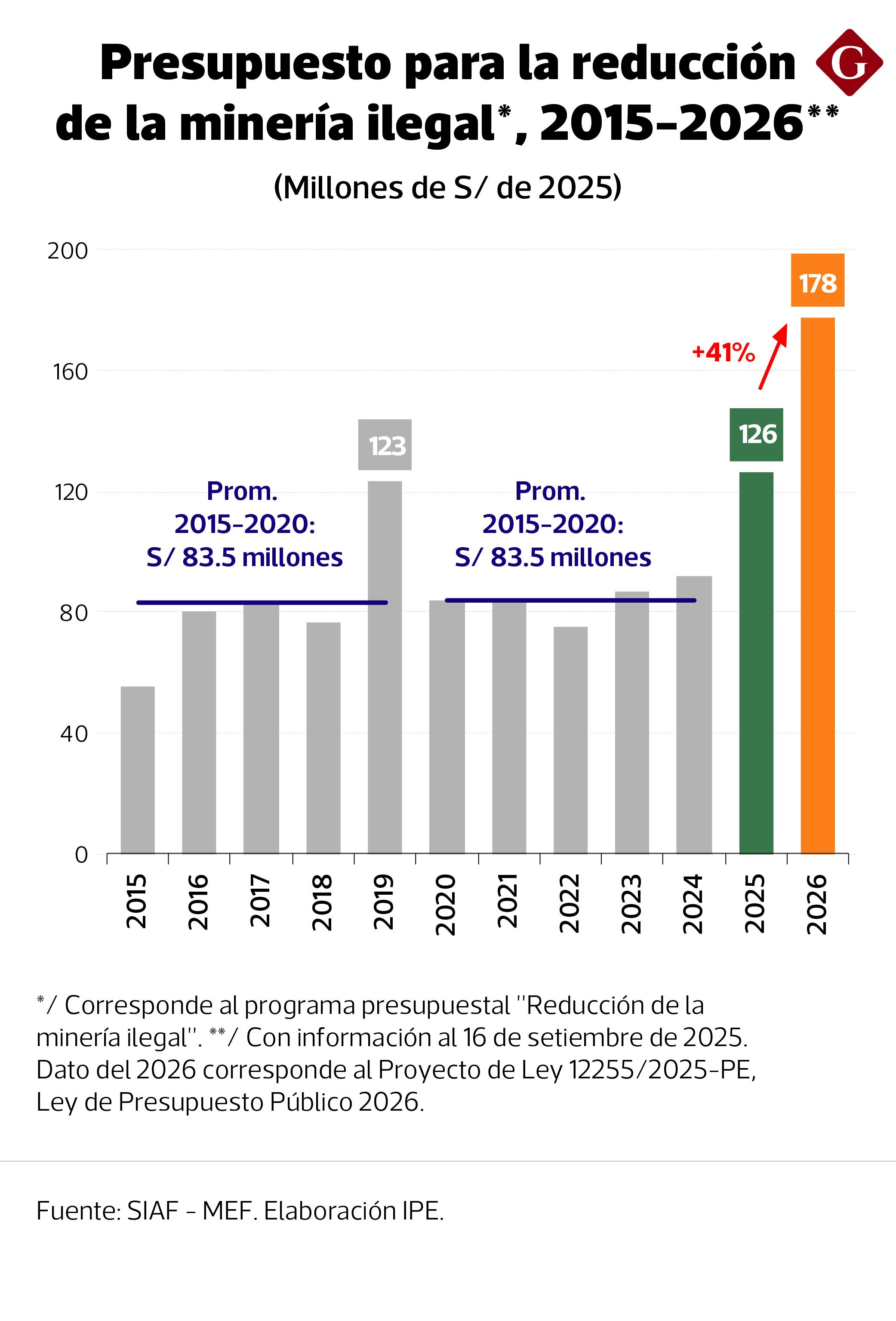 La expansión de la minería ilegal ha generado un entorno de inseguridad jurídica y física que desalienta la inversión y prolonga los plazos de desarrollo. Entre 2020 y 2024, el presupuesto para la reducción de la minería ilegal se redujo 32% respecto a 2019. Recién en 2026 se prevé un incremento significativo, con S/ 178 millones propuestos en el proyecto de ley de presupuesto, pero será importante velar por su ejecución eficiente.