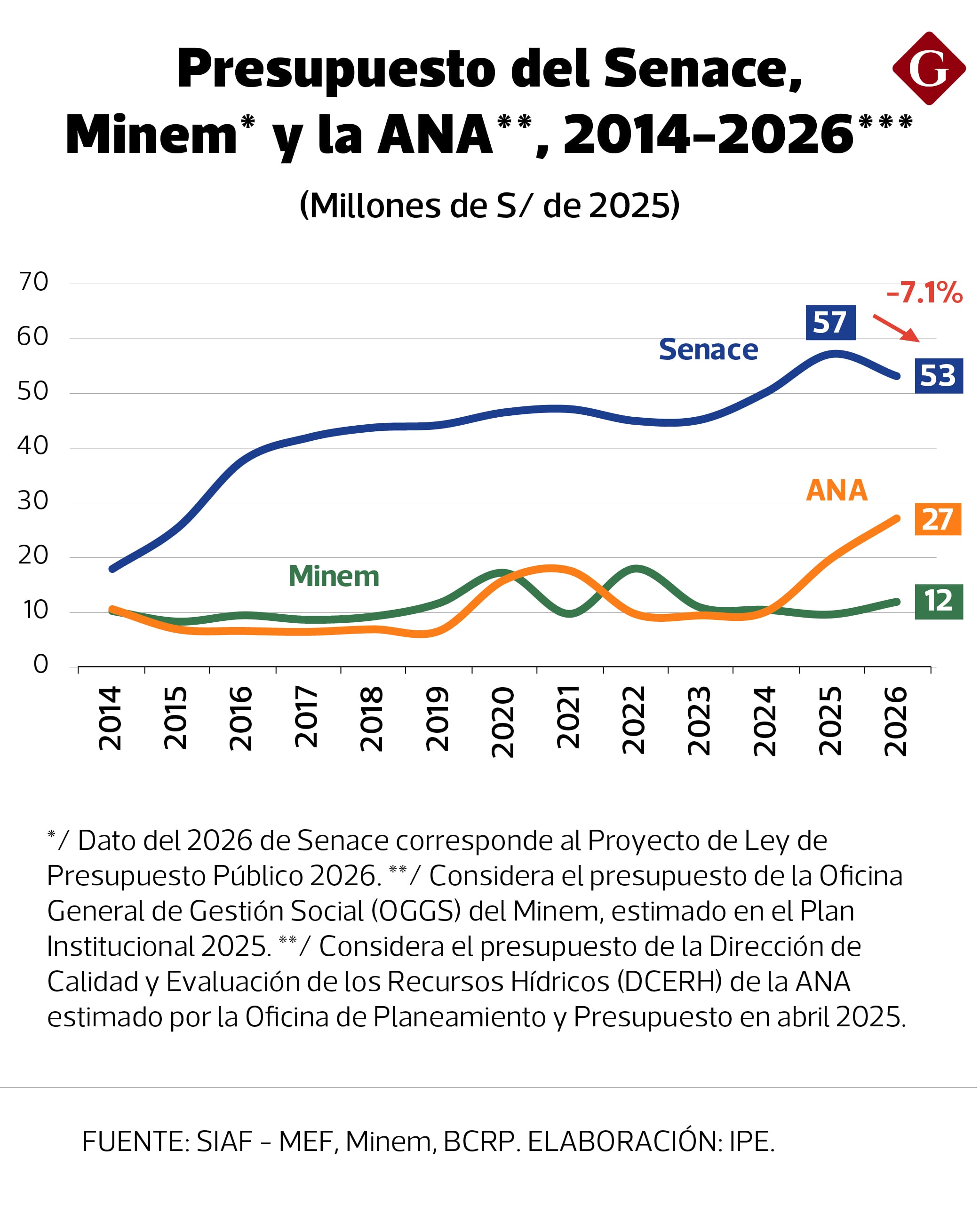 Además, también son a causa de recursos limitados de las entidades públicas responsables de gestionar estas autorizaciones, en contraste con la magnitud de la cartera minera a su cargo. El Senace, por ejemplo, cuenta con un presupuesto anual inferior a S/ 60 millones y en 2026 afrontaría un recorte de 7.1%.