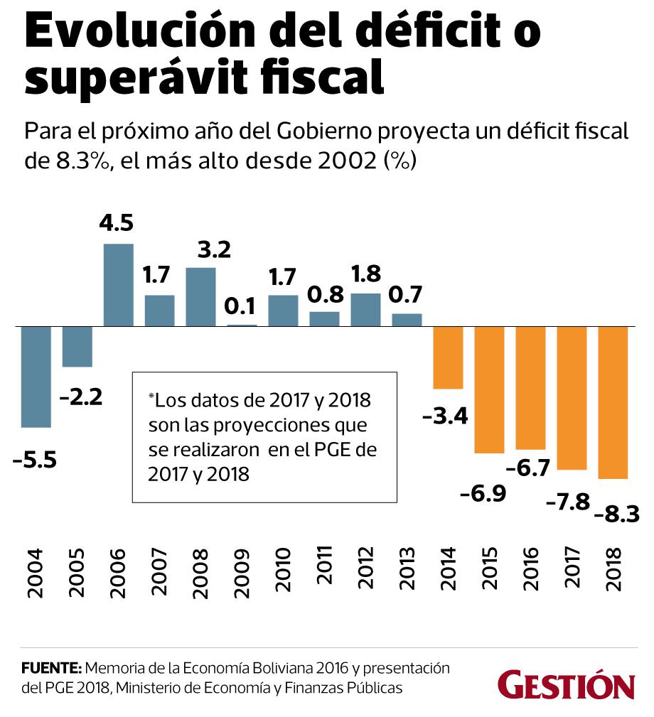 Así, el 2014 el déficit fiscal de Bolivia fue de 3.4%; el 2015 siguió cayendo a 6.9%; el 2016 retrocedió levemente a 6.7%; pero en el 2017 y 2018 cayó a su nivel más bajo de 7.8% y 8.3%, respectivamente.