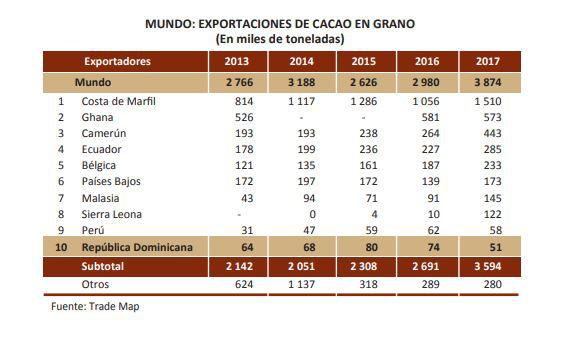 A fines del 2017, el Perú se encontraba en el puesto número ocho de productores de cacao, dentro del ranking mundial liderado por Costa de Marfil, Ghana e Indonesia. En lo que respecta a los países exportadores, el Perú se encuentra en el noveno lugar.