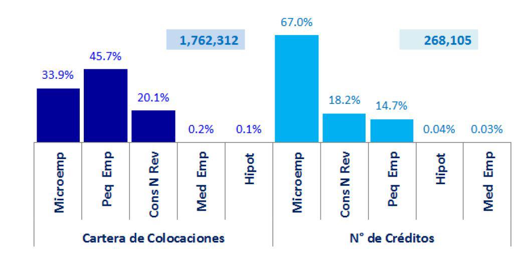 Al desagregarlo, precisa que la cartera de créditos en su mayor parte se encuentra conformada por créditos MYPE (micro y pequeña empresa), los que acumularon un saldo de S/ 1,403 millones. De este modo el 79.6% del stock de operaciones de crédito correspondió al segmento MYPE y sólo un 0.3% de los créditos se mantienen en los segmentos a Medianas Empresas e Hipotecarios.