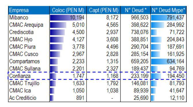 En su informe trimestral 2019, Financiera Confianza indica que se encuentra dentro del TOP TEN del segmento de Microfinanzas al mes de agosto de 2018 y se ubica en el quinto lugar del ranking de deudores Mype.