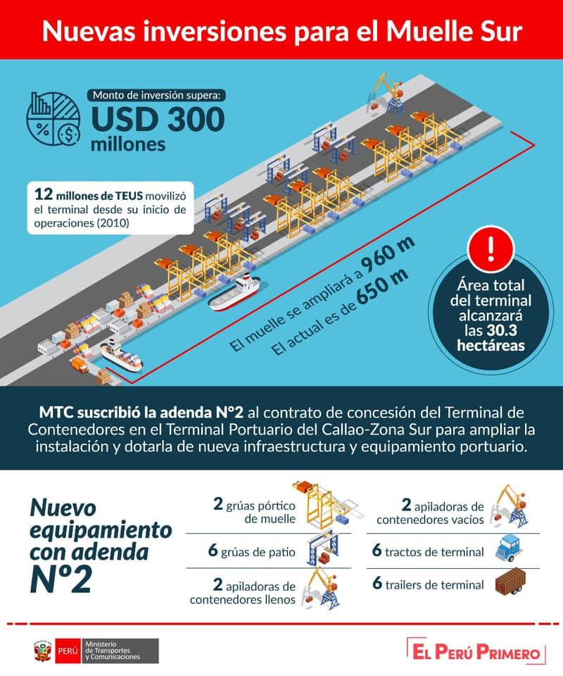 El Muelle Sur del puerto del Callao, operado por Dubai Ports World (DPW) Callao, aumentará su capacidad de atención de carga de contenedores, como resultado de los trabajos de ampliación y adquisición de nuevas grúas pórtico y otros equipos en esa instalación portuaria, que han sido contemplados en la adenda N°2 del contrato de concesión, que suscribió hoy esa empresa con el MTC.