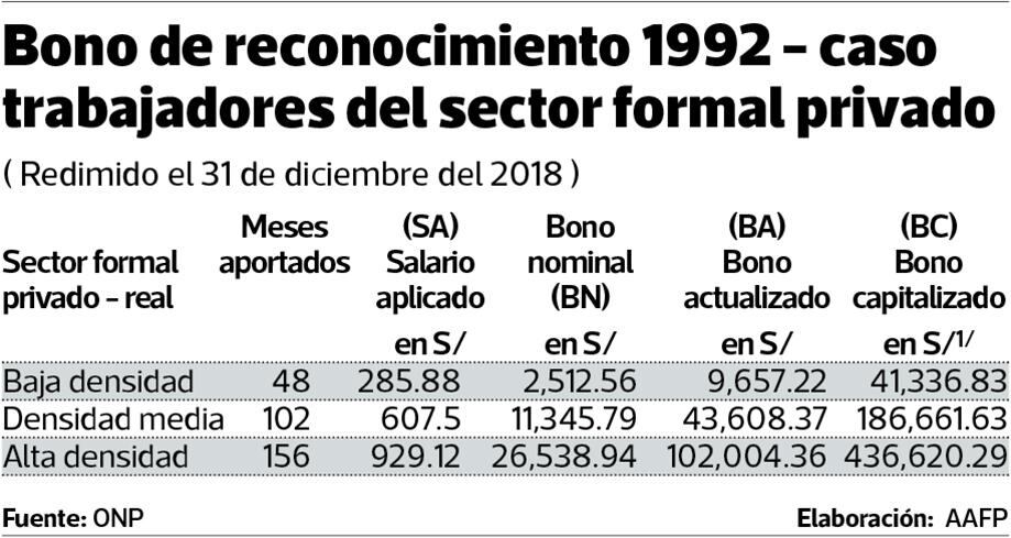 El estudio mostró los casos de tres trabajadores del sector formal privados afiliados a las AFP que antes de 1992 estaban inscritos en la ONP. Considerando que tiene distintos niveles de salarios y diferente número de meses aportados a la ONP (ver tabla) estimaron que el Estado les concedería bonos de reconocimiento nominales con un valor mínimo de S/ 2,512.56 y un valor máximo de S/ 26,538.56. Al actualizar estos montos por el Índice de Precios al Consumidor (IPC) reportados al 31 de diciembre del 2018, los jubilados obtendrían como mínimo S/ 9,657.22 y como máximo S/ 102,004.36.