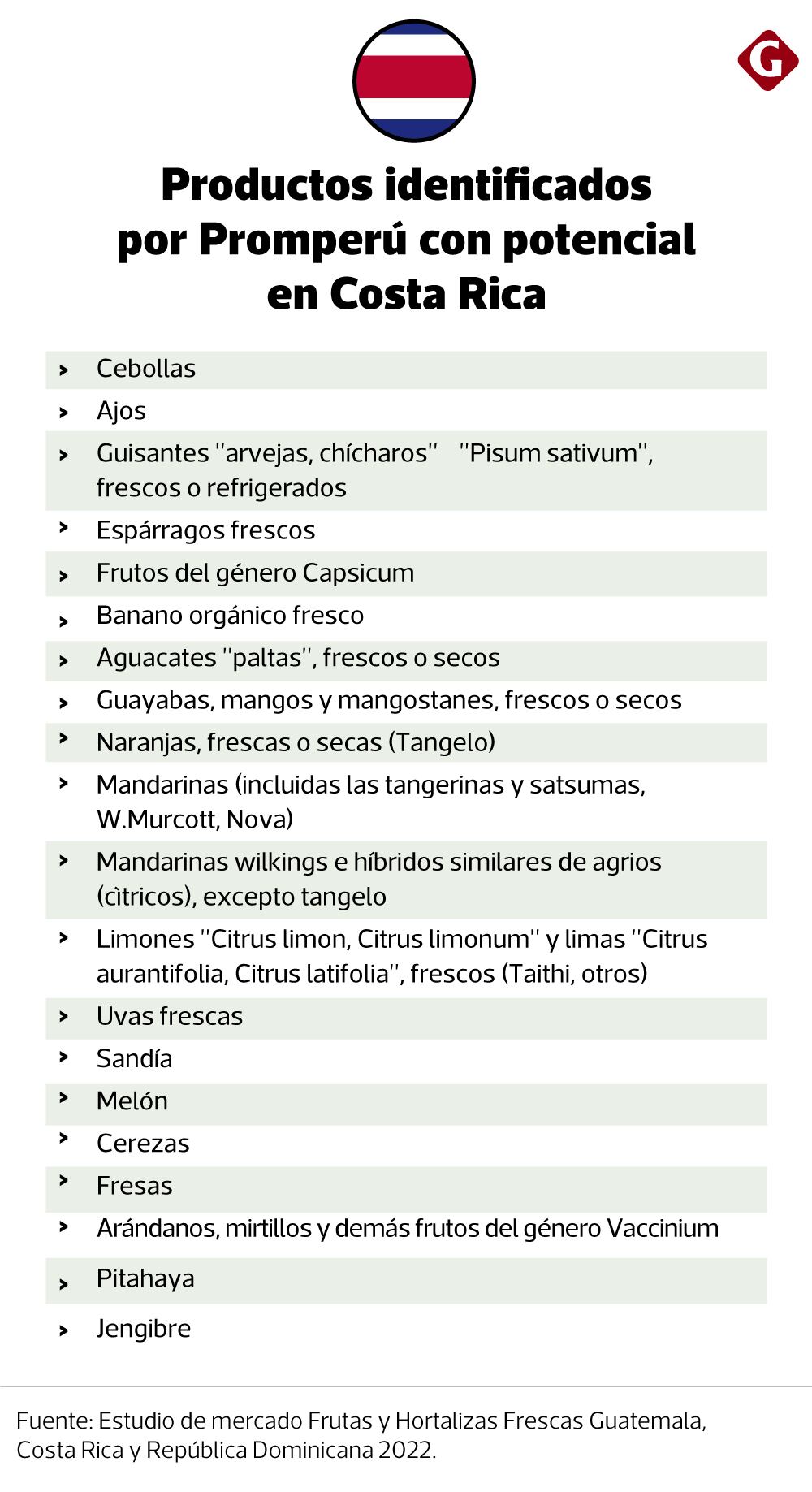 El informe de Promperú identifica un total de 20 productos con potencial para impulsar en Costa Rica, entre los que destacan las uvas frescas, sandía, cerezas y pitahaya. Precisa que, del total de productos agrícolas seleccionados de interés para la investigación, Costa Rica importó desde Perú un total de 11 de estos 20 productos en 2021, registrando un valor de US$12.9 millones.