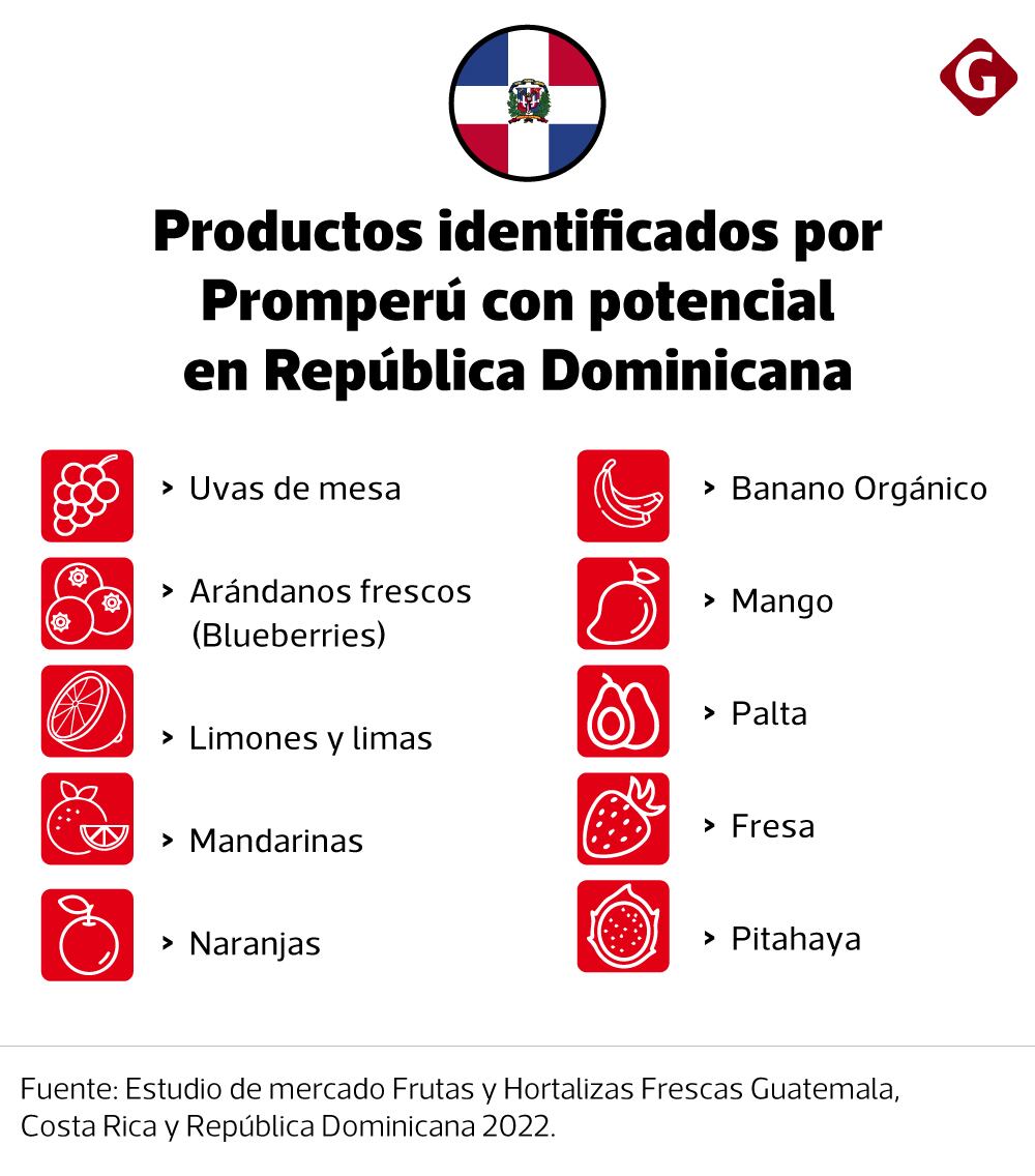 Respecto a República Dominicana, el estudio identificó 10 productos con potencial: uvas de mesa, arándanos frescos, limones y limas, mandarinas, naranjas, banano orgánico, mango, paltas, fresas y pitahaya.