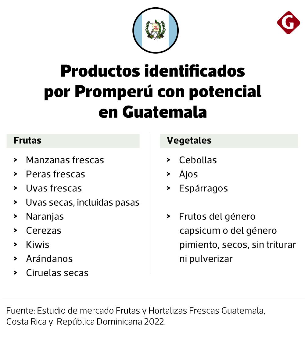 Así, se señala que las frutas con potencial en Guatemala son: manzanas frescas, peras frescas, uvas frescas, uvas secas, naranjas, mandarinas, cerezas, kiwis, arándanos y ciruelas frescas; mientras que en el caso de los vegetales, figuran las cebollas, ajos, espárragos y frutos del género capsicum.