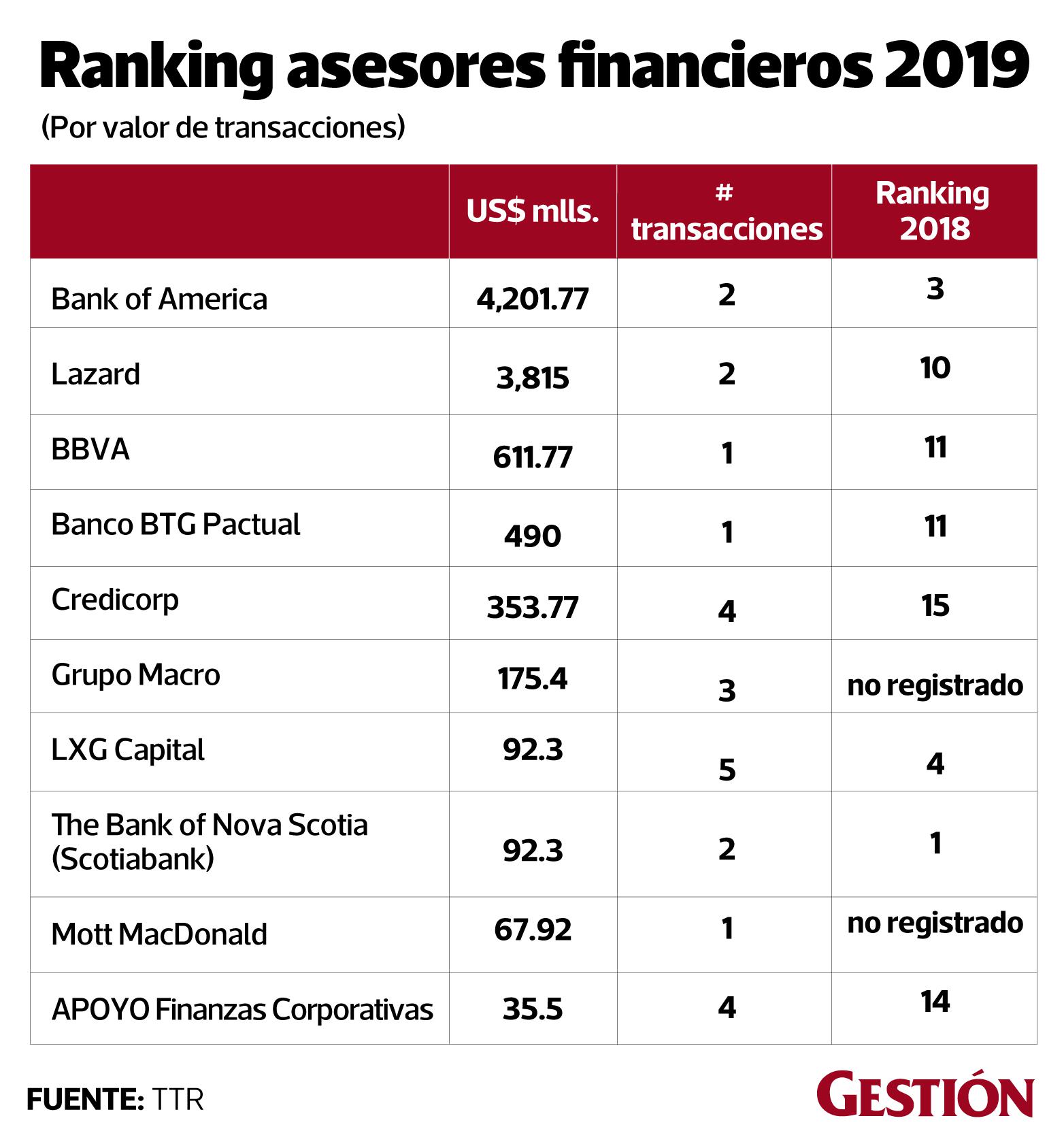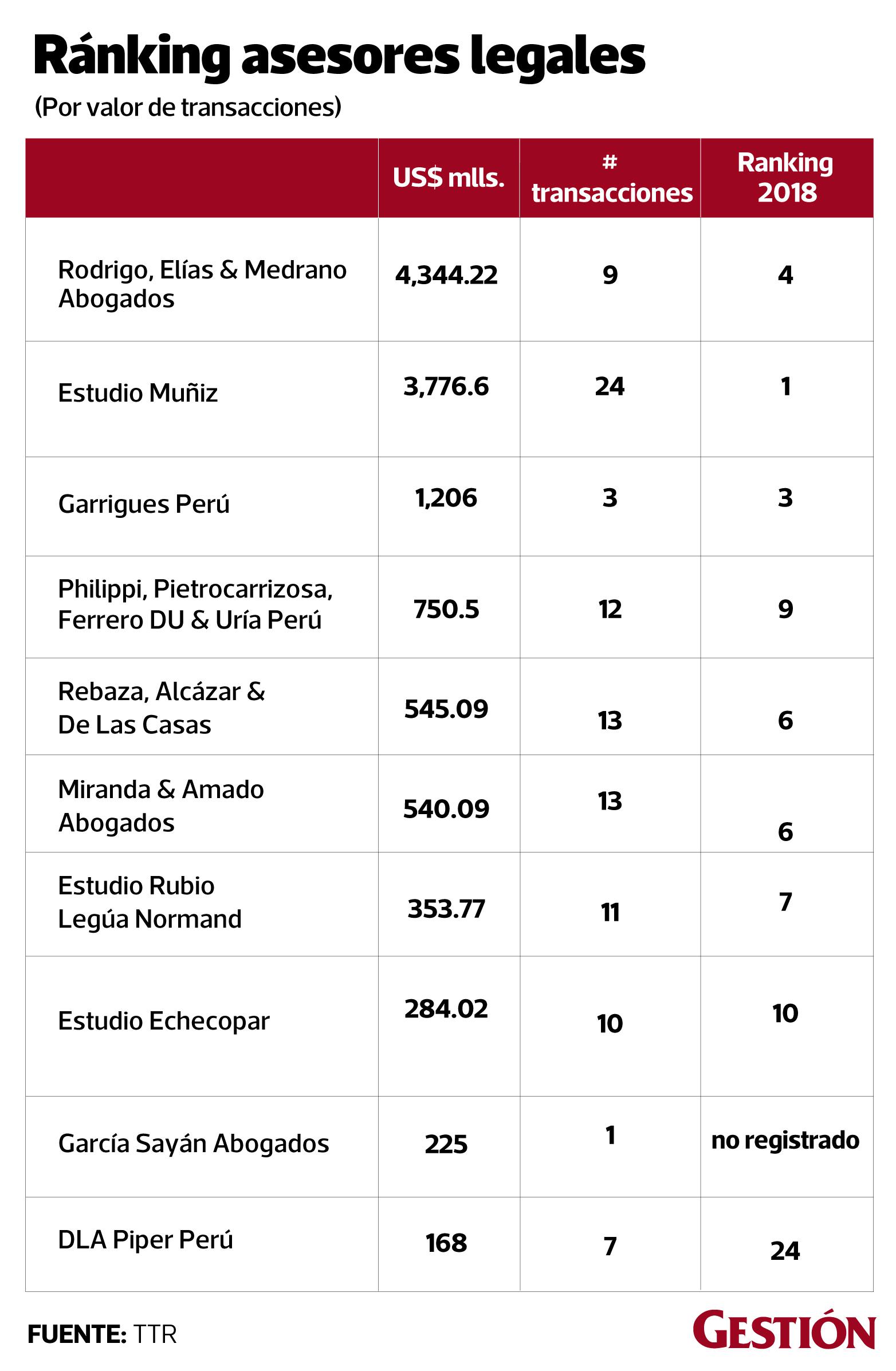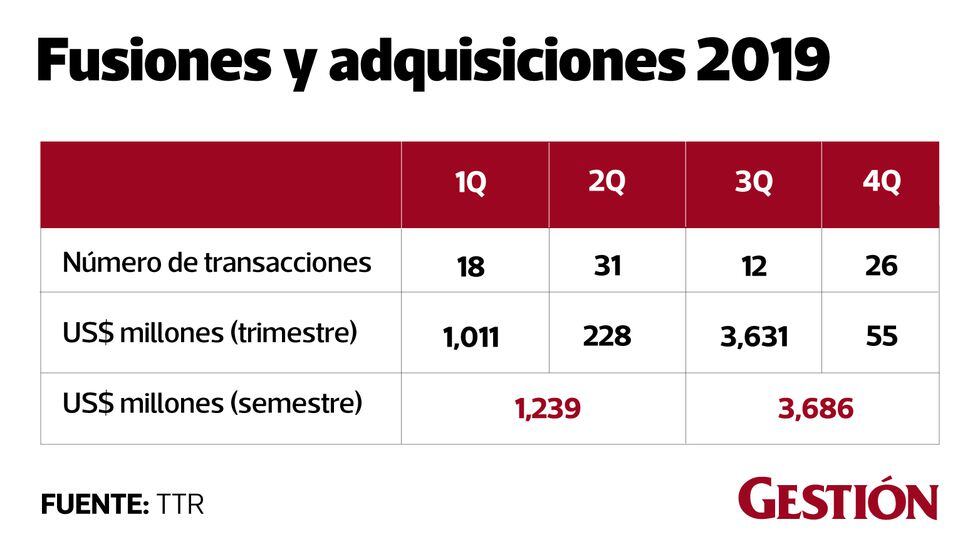 En el 2019 se realizó un total de 87 operaciones en fusiones y adquisiciones (M&A) en el mercado peruano. De ellas, se registró un total de US$ 4.925 millones. Alrededor del 75% del movimiento de capital ocurrió en la segunda mitad del semestre: fueron 49 las operaciones las registradas para el primer semestre, mientras que 38 para la segunda mitad del 2019; pero el movimiento de capital fue 297% más en el segundo semestre.
