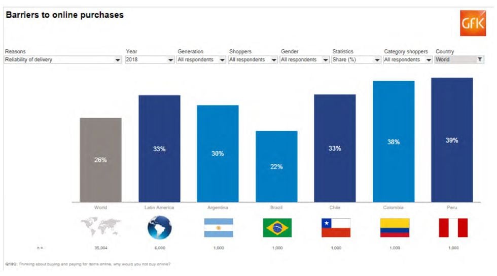 El 39% de peruanos desconfía de que los productos comprados vayan a ser entregados de manera correcta en su domicilio. Esto los ubica como los compradores más desconfiados de la región, superando de manera mínima a Colombia, pero también muy por encima del promedio mundial, que es de 26%.