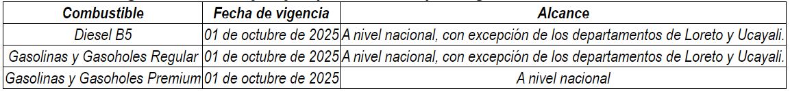 La medida entrará en vigencia a partir del 1 de octubre de 2025 para el diésel B5, las gasolinas y gasoholes regulares y las gasolinas y gasoholes premium.