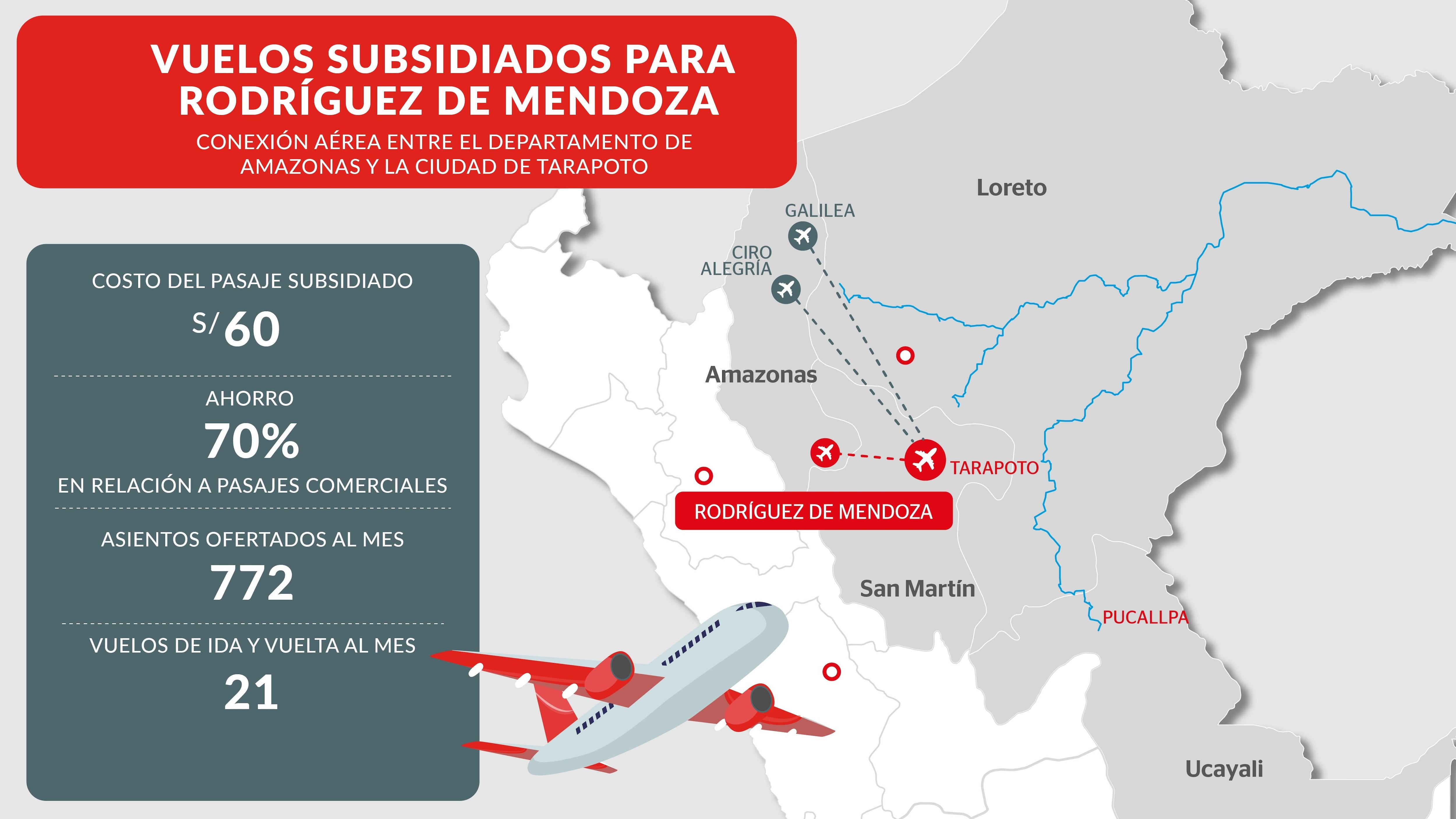 El trayecto Rodríguez de Mendoza-Tarapoto es la tercera ruta de vuelos subsidiados que el MTC ofrece en el departamento de Amazonas con conexión al aeropuerto de Tarapoto. Las otras dos conectan Galilea y Ciro Alegría con el mencionado terminal aéreo del departamento de San Martín.