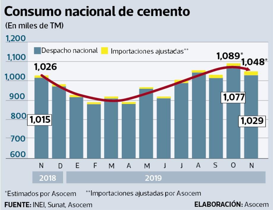 A noviembre, la producción de cemento fue de 930,000 toneladas, con un crecimiento de 3.2% según Asocem.