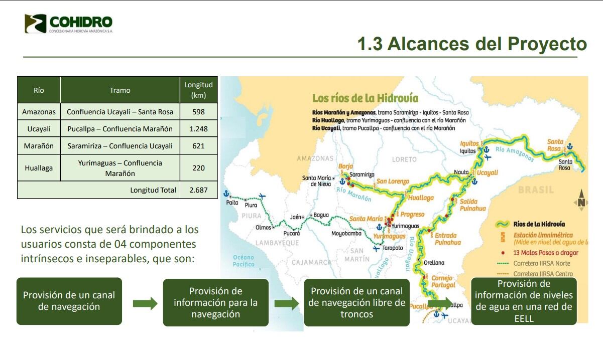 El proyecto Hidrovía Amazónica (2,687 km de longitud) buscaba mantener la navegación en condiciones seguras durante las 24 horas del día y los 365 días del año en cuatro ríos de la Amazonía: río Huallaga, Marañón, Ucayali y Amazonas.